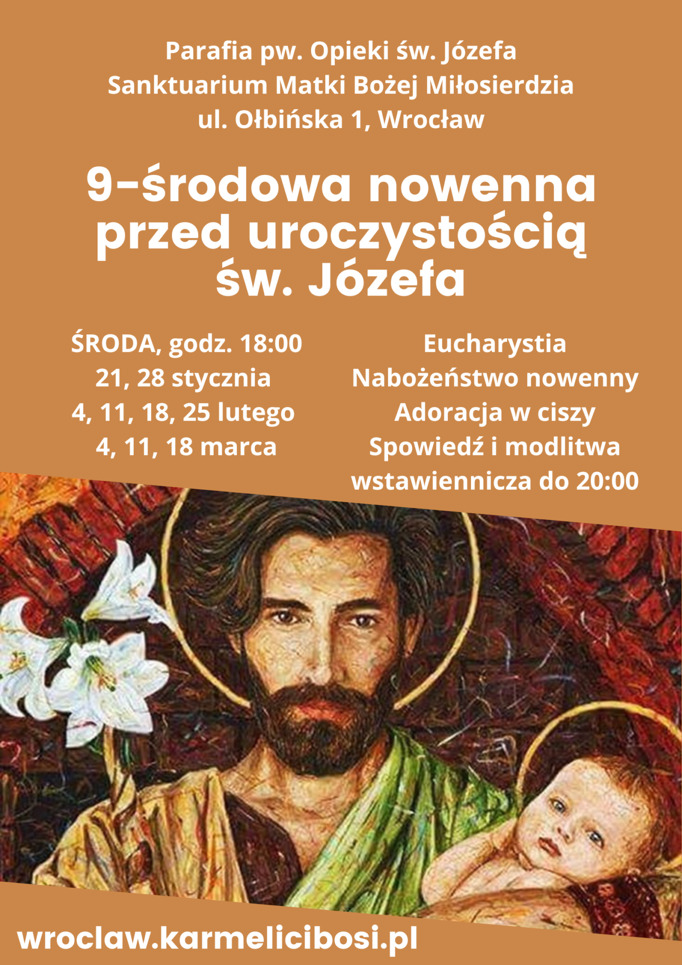 W środę, 21 stycznia, rozpocznie się dziewięciośrodowa nowenna przed uroczystością św. Józefa, Oblubieńca NMP, naszego Patrona. W każdą środę o godz. 18:00 Msza św. we wszystkich intencjach zapisanych w Księdze Mszy św. wieczystych z kazaniem o św. Józefie i nabożeństwo nowenny. Następnie w ramach „Środy Wstawiennicze u św. Józefa”: adoracja w ciszy oraz możliwość skorzystania ze spowiedzi i modlitwy wstawienniczej do godz. 20:00.