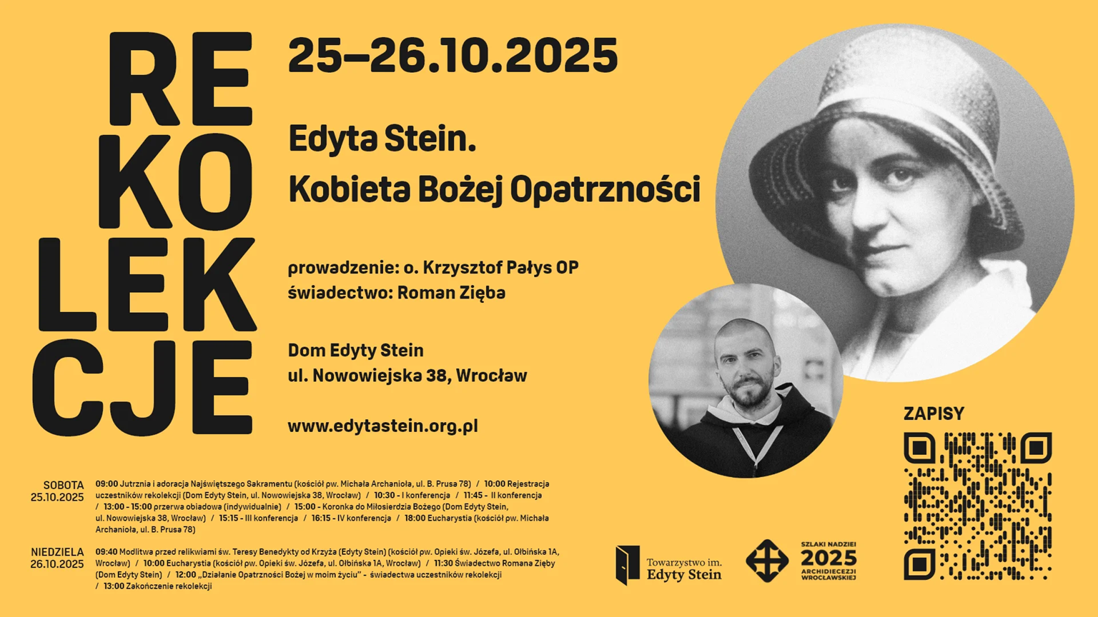 W ramach weekendowych rekolekcji o św. Teresie Benedykcie od Krzyża, które będą trwać w Domu Edyty Stein dla grupy zamkniętej, zapraszamy w niedzielę, 26 października, na Mszę św. w naszym kościele o godz. 10:00, podczas której kazanie wygłosi znany rekolekcjonista o. Krzysztof Pałys, dominikanin. Przed Eucharystią, o godz. 9:40 – modlitwa przed relikwiami św. Teresy Benedykty od Krzyża (Edyty Stein).