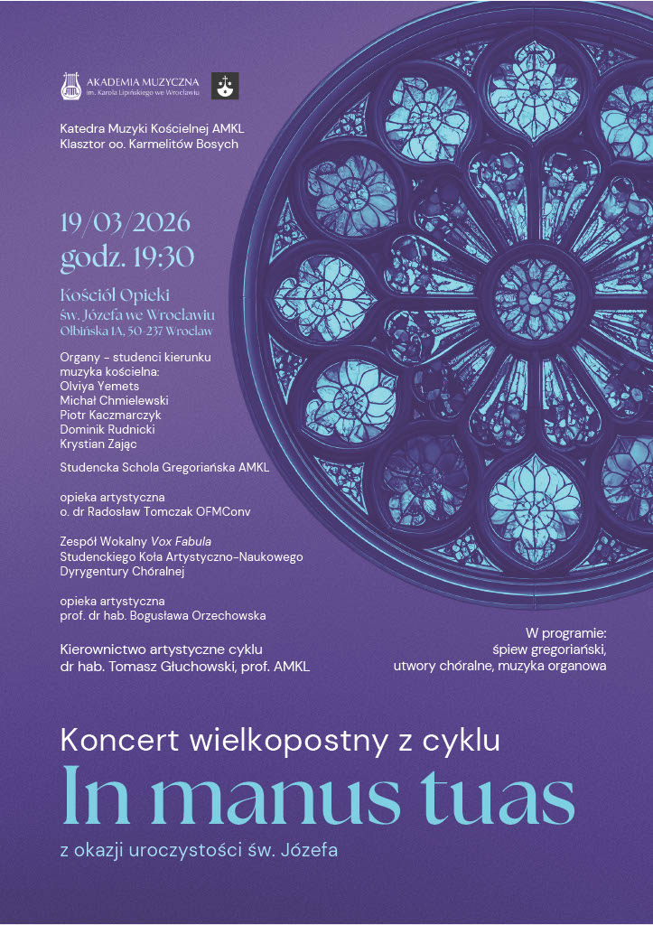 W ramach corocznych wielkopostnych koncertów „In manus tuas” zapraszamy w tym roku na wyjątkowy koncert, który odbędzie się w uroczystość odpustową św. Józefa, 19 marca o godz. 19:30, czyli po Mszy św. i procesji. W programie: śpiew gregoriański, utwory chóralne i muzyka organowa w wykonaniu studentów, absolwentów i pedagogów wrocławskiej Akademii Muzycznej im. Karola Lipińskiego. Szczegóły na plakacie.