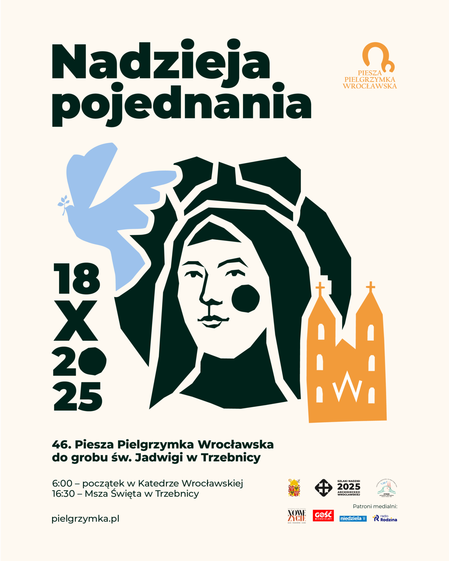 Serdecznie zapraszamy do wzięcia udziału w pieszej pielgrzymce do grobu św. Jadwigi w Trzebnicy w najbliższą sobotę, 18 października. Wyjście o godz. 6:00 sprzed Katedry. Msza św. przy ołtarzu polowym o godz. 16:30, której przewodniczyć będzie J.E. ks. Kardynał Grzegorz Ryś, Metropolita łódzki. Zapraszamy do naszej grupy 18. karmelitańskiej pod przewodnictwem naszego parafianina i współbrata o. Bogusława Wielgoszewskiego. Więcej informacji na stronie: pielgrzymka.pl